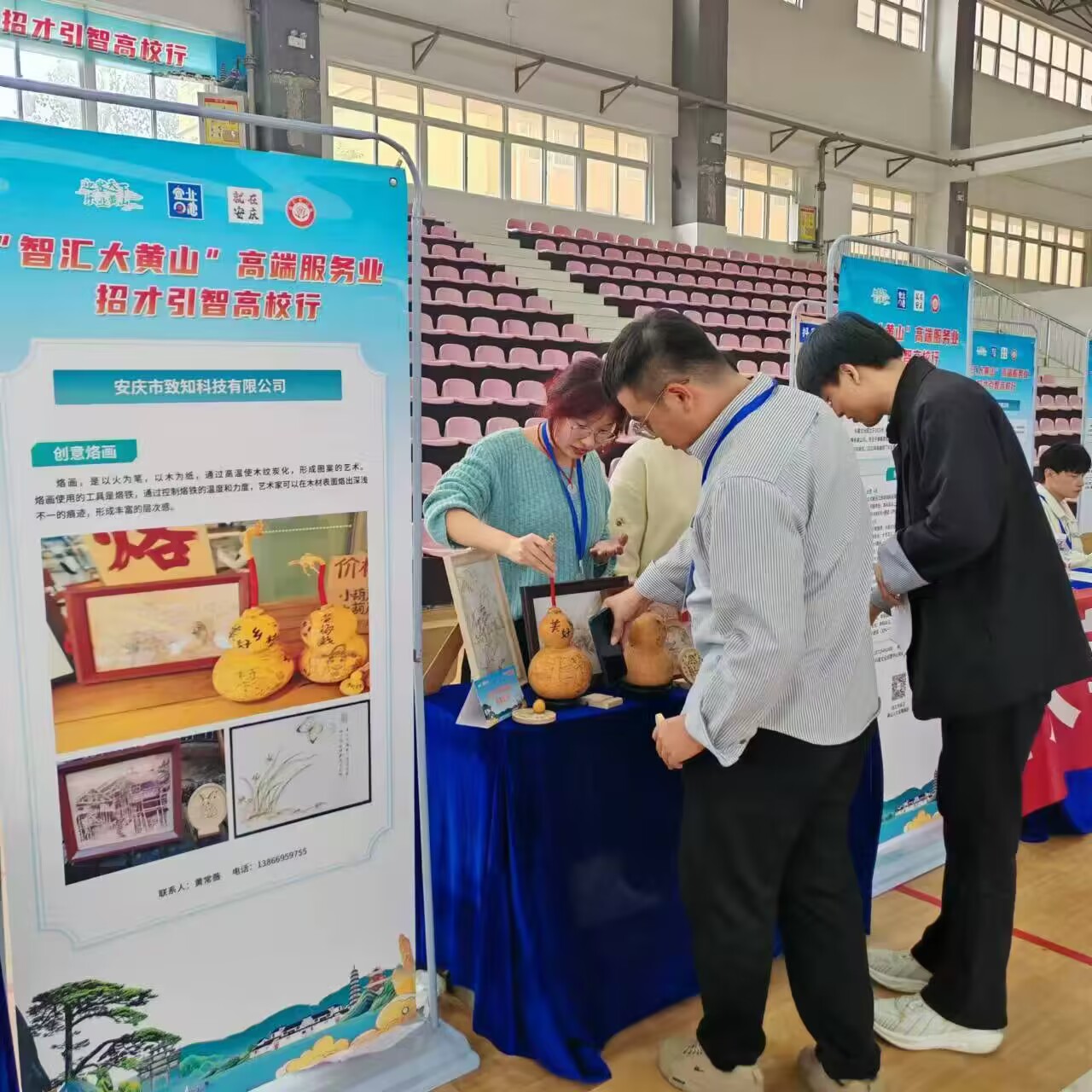 10月16日,伟德国际1949始于英国应邀参加由黄山市人力资源和社会保障局主办的“智汇大黄山”高端服务业招才引智系列活动。该院数名学生走进安徽外国语学院进行非遗烙画的科普宣传活动。他们将所学付诸实践,进行非遗烙画的科普宣传活动。