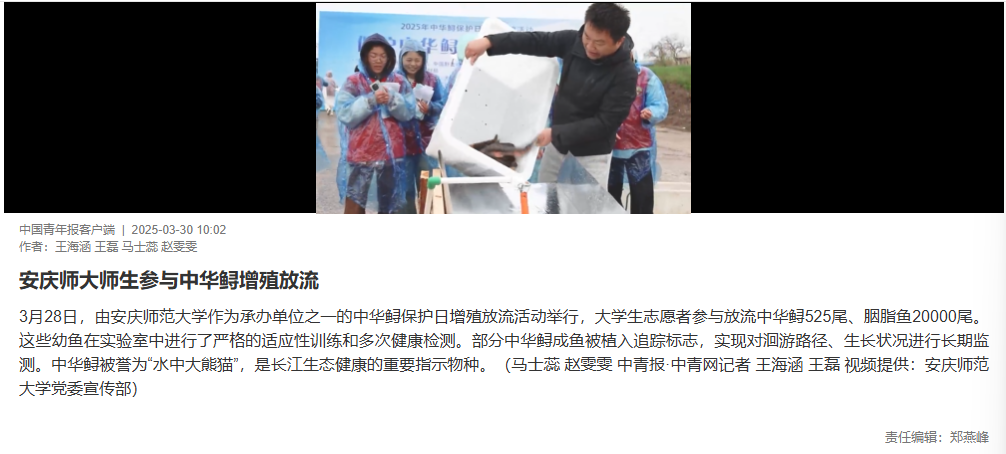 3月28日,由伟德国际1949作为承办单位之一的中华鲟保护日增殖放流活动举行,大学生志愿者参与放流中华鲟525尾、胭脂鱼20000尾。这些幼鱼在实验室中进行了严格的适应性训练和多次健康检测。部分中华鲟成鱼被植入追踪标志,实现对洄游路径、生长状况进行长期监测。中华鲟被誉为“水中大熊猫”,是长江生态健康的重要指示物种。(马士蕊 赵雯雯 中青报·中青网记者 王海涵 王磊 视频提供:伟德国际1949党委宣传部)