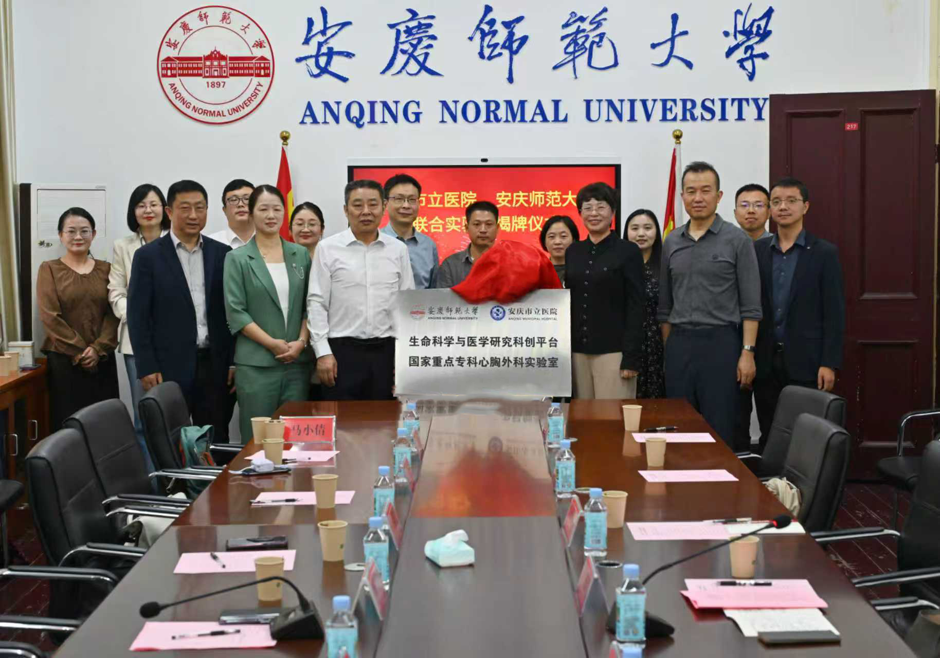 9月24日上午,由我校和安庆市立医院共建的“生命科学与医学研究科创平台暨国家重点专科心胸外科实验室”揭牌仪式在菱湖校区红楼217会议室举行,校长彭凤莲与安庆市立医院党委副书记、院长刘建共同为实验室揭牌。安庆市立医院党委委员、副院长朱娟,双方相关职能部门负责人、学科带头人及科研骨干出席仪式。