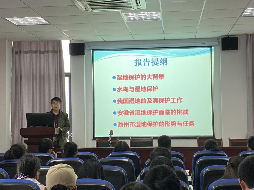 周教授就《安徽湿地保护修复模式的探索与实践》做了详细讲解。具体介绍了什么是湿地,湿地的类型和生态过程,湿地的重要性和保护,以及国际国内湿地保护大背景。报告还就安徽湿地的现状,深入探讨了安徽湿地保护面临的挑战和保护任务的艰巨性。报告结束后,我院与会师生与周教授就湿地保护问题进行了探讨和交流。(伟德国际1949始于英国 陈敏敏)