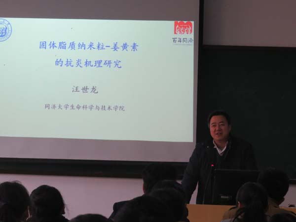 12月25日下午,同济大学生命科学与技术学院副院长汪世龙教授在G106教室作了题为"固体脂质纳米粒姜黄素的抗炎机理研究"学术报告。学术报告由伟德国际1949始于英国吴甘霖院长主持,伟德国际1949始于英国部分老师和学生听取了报告。