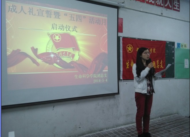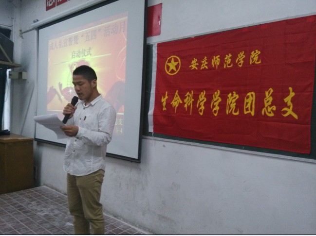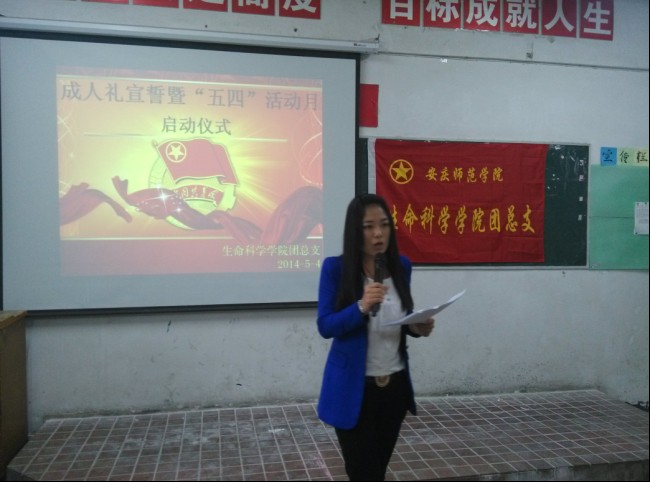 13时30分,仪式正式开始。首先由学生代表12级动检专业刘正奎同学发言,该同学品学兼优,本学年获校级“优秀青年”表彰,他结合自身经历,阐述了当代大学生的使命和责任,以及如何做到爱国,如何完成使命。10级生科专业丁梅同学代表全院同学宣读倡议书,号召青年学生弘扬“五·四”精神,坚定信念,把握时代脉搏;奋发学习,争做时代精英;勇于担当,注重全面发展。生科院田蜜老师作为教师代表做了发言,她提到,九十五年来,“爱国、民主、进步、科学”的“五·四”精神激励着一代又一代有志青年学子为追求进步和发展奋斗不息,今天以成人礼宣誓的方式来纪念“五四”爱国运动,就是告诉广大同学成人意味着责任,独立和自强,希望全院青年学生高擎“五四”精神的火炬,勇担时代责任,发奋自强,开拓创新,秉承安庆师范学院“敬敷示范,勤学笃行”的育人理念,展现生科院大学生昂扬向上的精神风貌,为建设文明校园贡献力量。