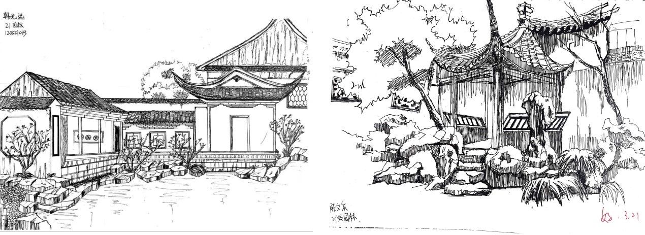 在陈陈老师的指导下,我们掌握了一些描绘假山,水池,树木,亭廊的方法,同学们对实景的描绘能力、对线条的控制能力、对明暗灰度的划分能力都获得很大提高,通过现场教学和绘画练习,不少同学作品,整个空间感层次明显,群落配置适宜,透视效果好。