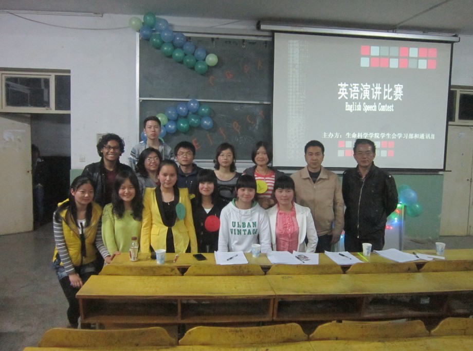 此次比赛共有12名选手参与角逐,比赛过程十分精彩。赛程分为两个环节,第一环节以“木桶效应”为主题,每位选手进行限时5分钟的演讲,选手们演讲内容精彩,立意新颖,尤其是十一号选手陶敢争同学以“元芳此事你怎么看”为关键词的演讲,语言细腻,发音标准,博得现场评委和观众的一致好评;第二环节选手两两一组以指定题目现场进行模拟对话,选手们表现灵活,气氛活泼,特别是俞雅文同学故意把Chris的年龄说成了30岁,突然“长了8岁”的Chris在场边大呼无奈,逗乐了大家。比赛结果,11级生科1班张扬同学获得第一名,其他5名同学分获第二、三名。赛后,Chris老师和魏和平院长分别就比赛过程作了精彩点评,结合选手表现提出需要改进和提高的地方,选手们听后感觉获益匪浅。