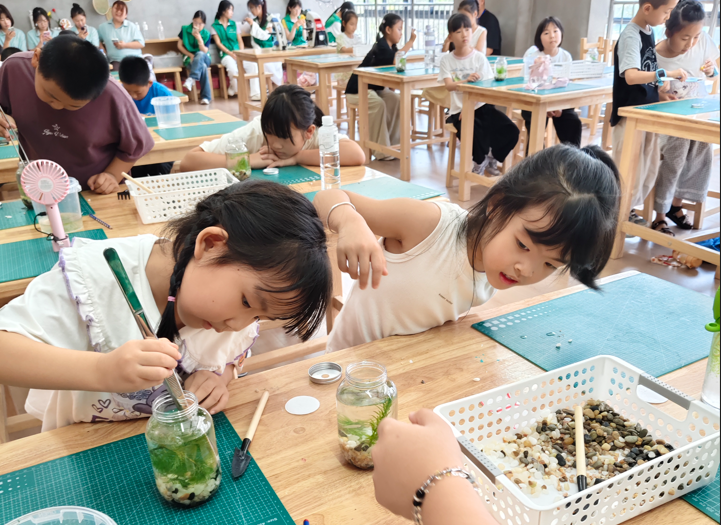 聚焦动手实践,“生态瓶 DIY 制作”活动让孩子们化身“小小生态设计师”。“植物给鱼虾提供食物和氧气,鱼虾的排泄物被细菌和螺分解成养分,又能被植物吸收——这就是生态系统循环的奥秘!”伟德国际1949始于英国教师潘扬向孩子们一一讲解了大自然生态循环的奥秘。在团队成员的帮助下,孩子们将石砾、水生植物、小型鱼虾、硝化细菌依次放入玻璃瓶,再加入装饰小摆件,构建起一个自给自足的微型生态系统。“孩子们非常有创造力,他们设计的生态瓶都非常美观且有趣。”潘扬补充道,通过亲手制作生态瓶,孩子们不仅理解了生态平衡的重要性,还培养了观察力和耐心,激发了他们对自然生态的浓厚兴趣。