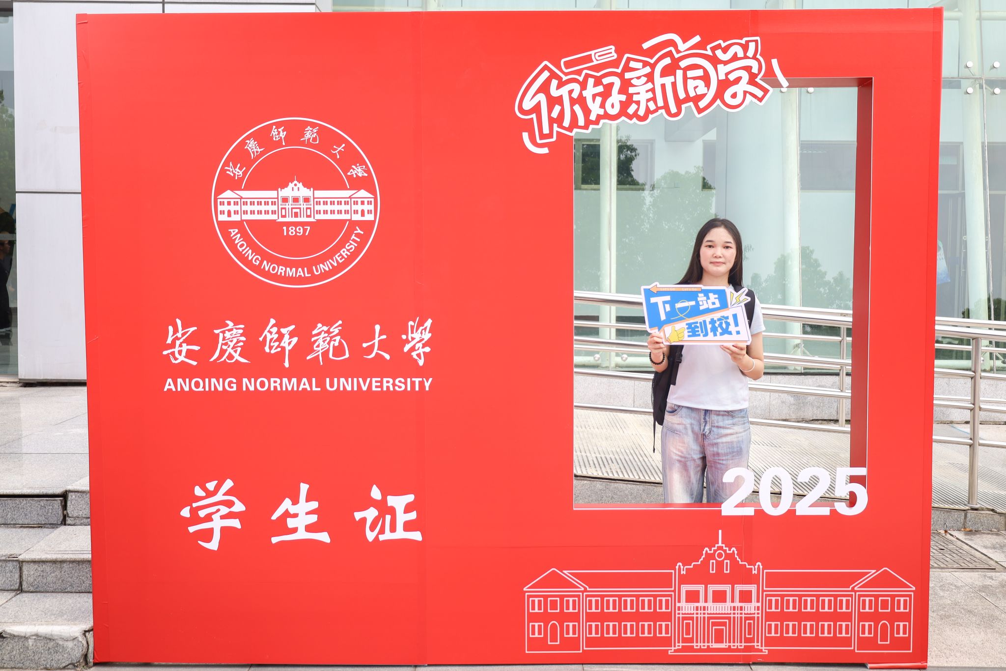 “在报到前一周,对接志愿者学姐就加了我的微信,给我发了安庆的特色小吃,还有学校的校园地图,让我对陌生的环境少了很多顾虑。”来自广西的瑶族新生、生物科学类专业2025(4)班的卢丽,在完成报到后在体育馆门前的打卡牌前拍照留念,记录开学第一天。