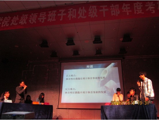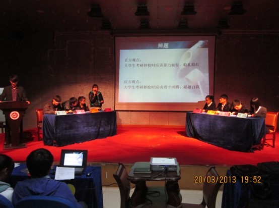 本次比赛分为两个场次,上半场辩题为“体育明星偶像化是否有利于体育事业的发展”,辩论双方展开激烈辩论,台上唇枪舌剑,现场的气氛逐渐升温。下半场比赛中,辩论双方以“大学生考研择校时应该量力而行,稳扎稳打”还是以“大学生考研择校应该勇于拼搏,超越自我”的观点进行辩论,双方通过立论,攻辩,自由辩论,结论等阶段,对各自所持观点,紧扣主题,进行阐述,将此次辩论赛气氛推向高潮。最后由双方辩手作总结陈词,并通过和现场观众进行互动,拉近了台上台下的距离。比赛结束,依据评委现场打分,12级生科1班、12级园林班、12级生科2班分获荣获一、二、三等奖,并评出优秀辩手若干名。赛后,团总支曹勇老师和丁元春老师分别结合辩手的表现作出了精彩的点评。