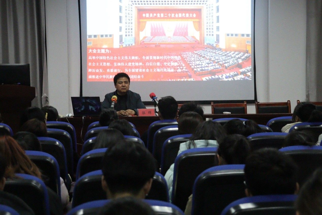 张辉向同学们深入分析了学习领会党的二十大精神的重大意义,介绍了党的二十大报告的主要内容,并结合大学生的学习生活实际和学院专业特色带领同学们深入学习领会党的二十大精神实质。他同时结合党的二十大报告内容分析了党关于青年和青年工作的重要精神。他要求同学们一定要全面深入学习贯彻党的二十大精神,希望大家牢记总书记在二十大报告中对广大青年提出的期望,要坚定不移听党话、跟党走,怀抱梦想又脚踏实地,敢想敢为又善作善成,立志做有理想、敢担当、能吃苦、肯奋斗的新时代好青年,让青春在全面建设社会主义现代化国家的火热实践中绽放绚丽之花。