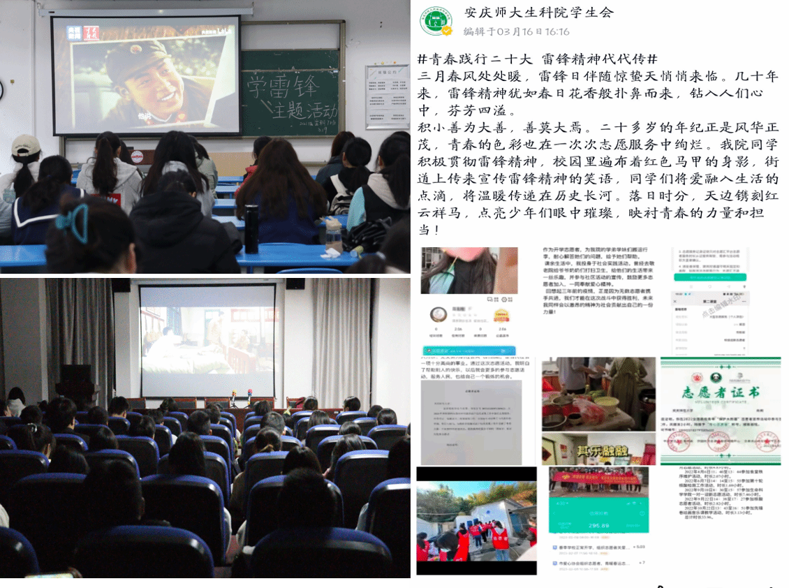3月12日,学院绿叶志愿服务队于生科院101教室和202教室开展雷锋精神观影活动。为进一步增进学生对雷锋事迹的了解,该志愿服务队特意挑选了影片《雷锋的微笑》,希望观影学生从影片中了解雷锋,从雷锋事迹中体悟雷锋精神。
