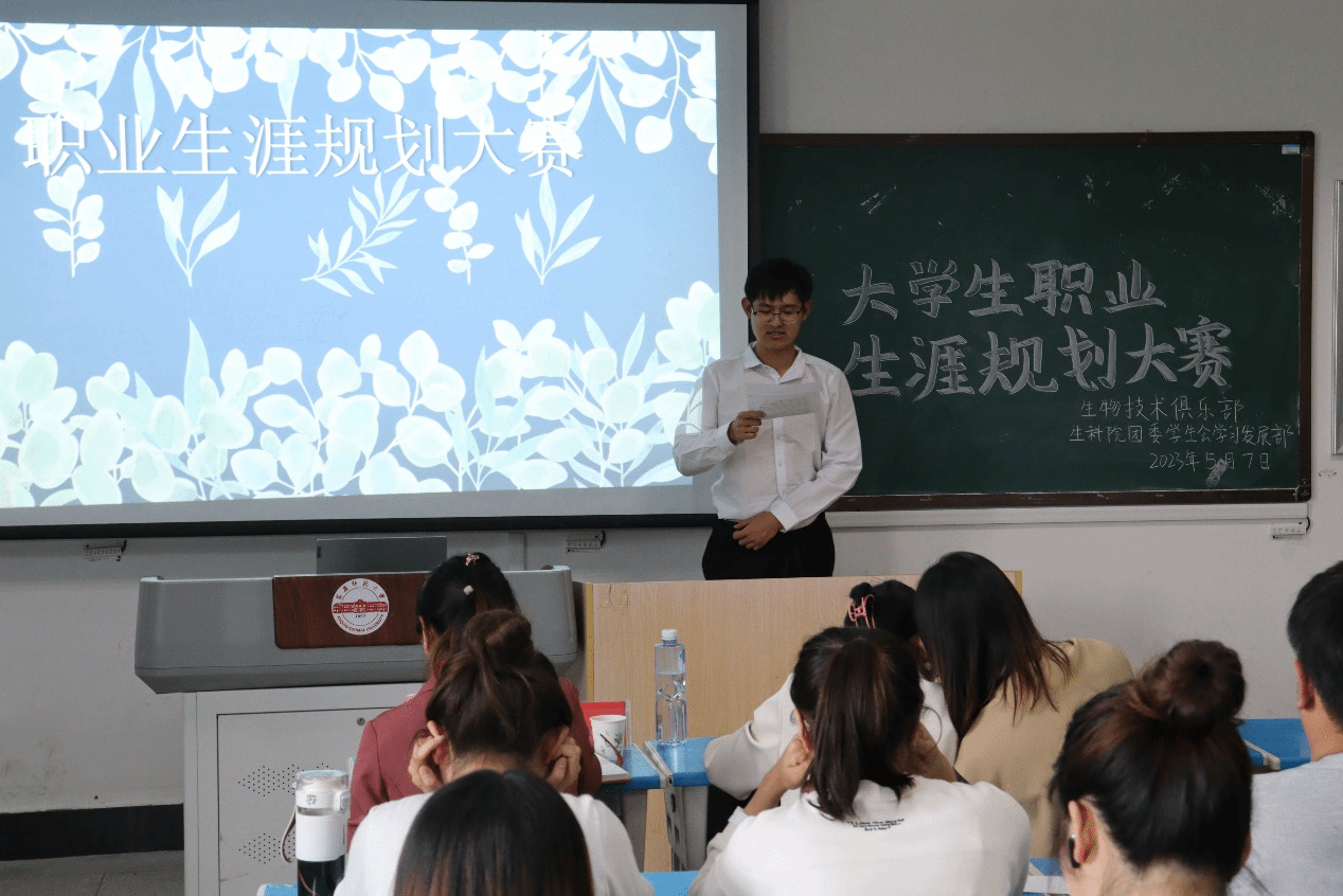大赛共分为PPT展示和评委点评两个环节,来自2021级、2022级的10余名学生参加决赛。在PPT展示环节,每位参赛选手针对自我认知、职业认知、职业决策、计划与路径、评估与调整、职业道德等6个方面,对自己的《职业生涯规划设计书》进行具体形象的陈述。2021级生物技术专业周君以自己创立生物技术俱乐部为引线,条理清晰、循循渐进地对自己的未来进行了完整的规划;而孙太平同学则是把自己的职业生涯规划分为三部曲——自我认知、环境分析、就业前景,一步一步地描绘着自己的蓝图。2022级生物科学2班李美林以张桂梅引出自己的职业理想,通过制定短期、中期和长期规划为成为一名优秀的人民教师作铺垫。通过紧张激烈的现场展示与答辩,最终李美林凭借整体结构完整、逻辑清晰、详略得当、重点突出的作品脱颖而出,得到在场评委和同学们的一致好评,摘取了本届职业规划大赛桂冠,孙太平和周君分获二三等奖。