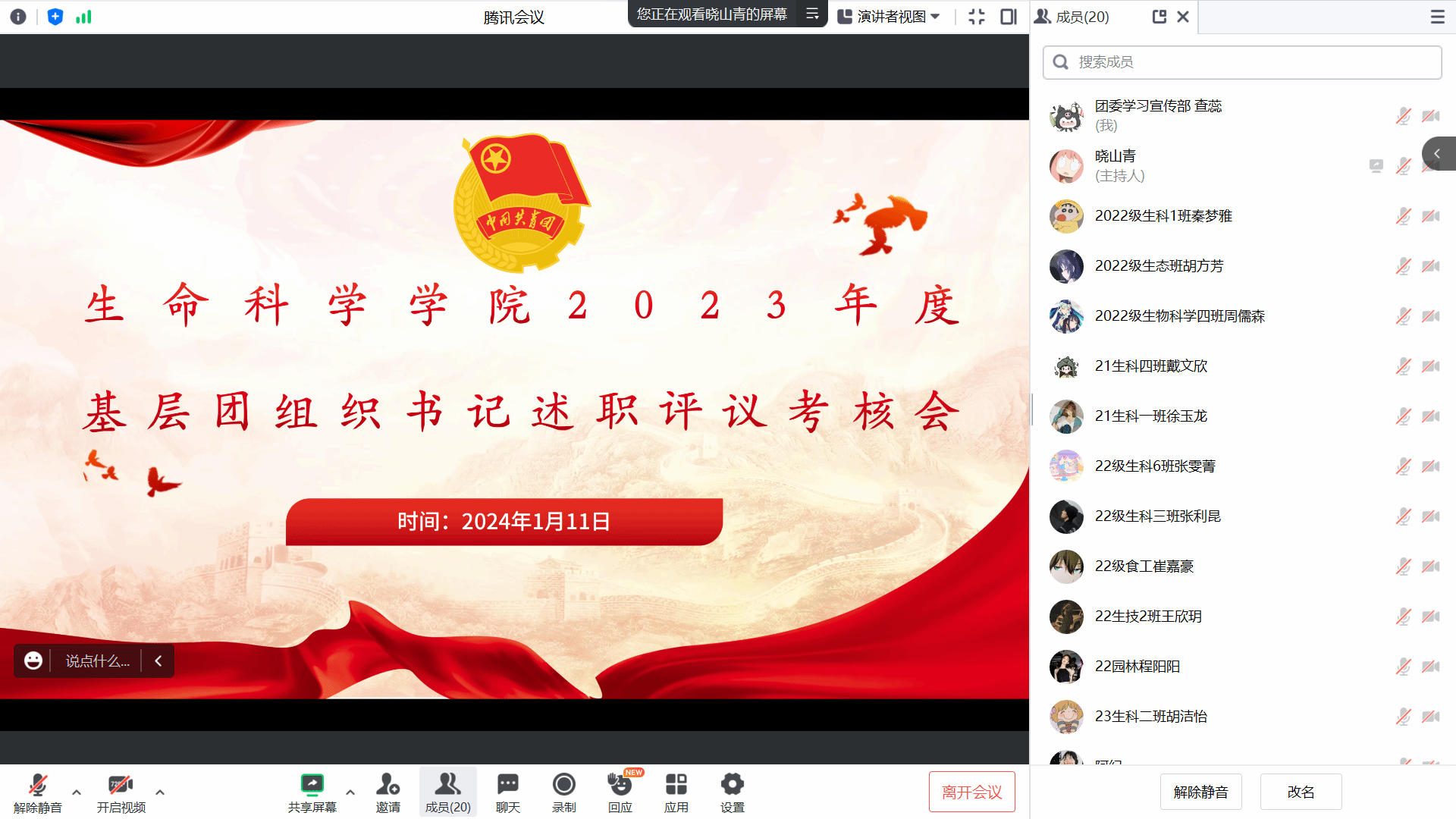 1月11日,伟德国际1949始于英国在线上召开2023年度基层团组织书记述职评议考核会,对2022级各班团支部进行现场述职考核,进一步推动基层团组织的组织力、引领力、服务力和大局贡献度协同提升,各班团支书及团委负责人徐启凤参加会议。
