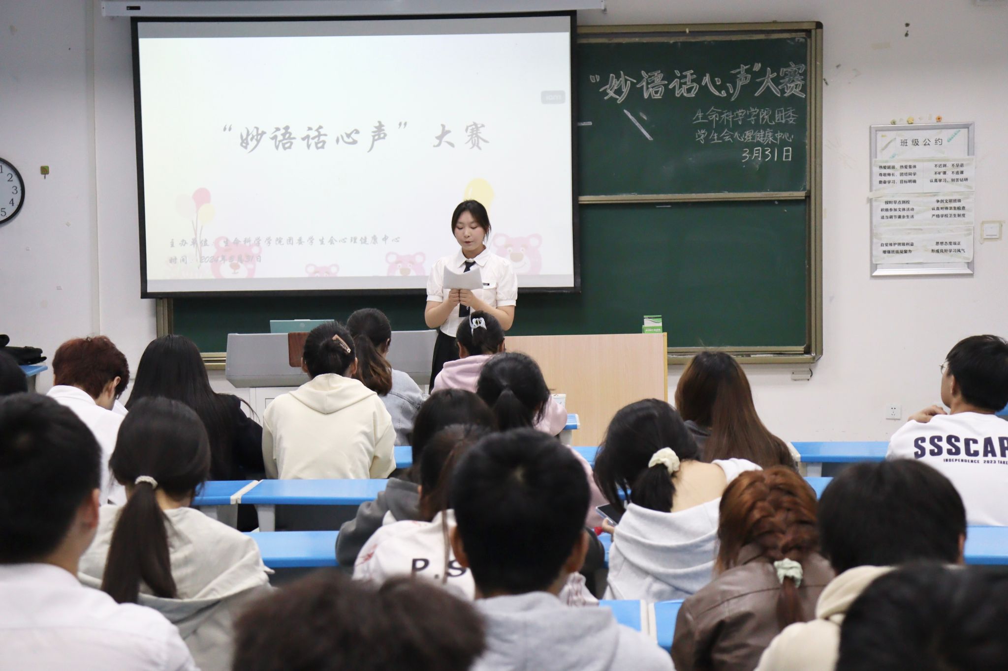 在充足的前期准备下,参赛选手、观众及嘉宾评委有序进场。活动开始前,主持人首先为大家介绍本次“妙语话心声”活动的比赛规则及大致流程。
