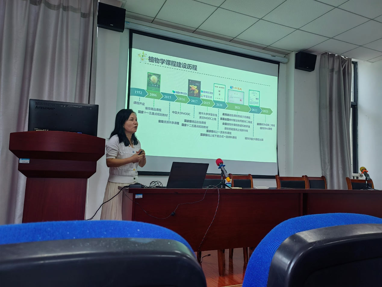 随后,赵毓教授以植物学课程为例,从一流课程概况和建设历程、一流课程建设、一流课程建设成效等三个方面详细介绍了植物学的教学过程。她通过丰富的案例和生动的讲解,展示了“三段递进”混合式教学在提升学生科学素养、增强学习兴趣和创新能力方面的重要作用,最终实现让学生“心中有数”、“目不转睛”、“念念不忘”和“温故知新”的教学目标。
