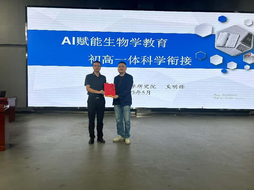 吴明锋老师以AI技术在生物学教育中的应用展开讲解,结合大量实际案例,从落实依标教学、教学理念转型、评价体系转向和初高一体衔接四个方面展示了AI工具在教学资源开发、课堂互动、学生个性化学习指导等方面的独特优势,为在场师生带来全新教学思路。讲座结束后,副院长李从虎副代表学院向吴明锋老师颁发荣誉证书,对其带来的精彩讲座表示感谢,并期望未来能在教学与科研等方面进一步合作交流。