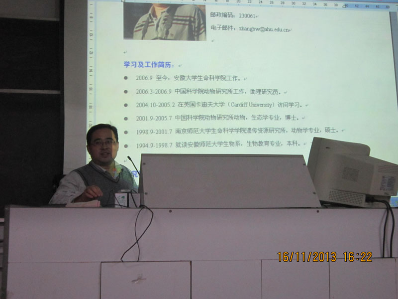 11 月 16 日 下午,中国动物学会两栖爬行动物学分会理事、安徽大学张保卫博士应邀在菱湖校区414教室作了“长江中下游区域小麂系统地理和群体遗传学分析:基于mtDNA控制区序列变异”专题学术讲座。伟德国际1949始于英国100多名师生聆听了报告,报告会由伟德国际1949始于英国副院长魏和平博士主持。